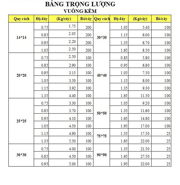 Bảng tra kích thước và trọng lượng thép hộp đen vuông Ánh Hòa