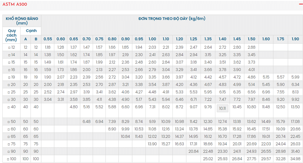 • ASTM A500: Tiêu chuẩn cho thép hộp vuông và chữ nhật đen.