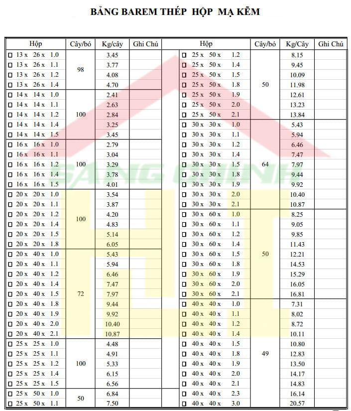 | Loại thép hộp | Kích thước (mm) | Tiêu chuẩn | Trọng lượng (kg/m) | Giá tham khảo (VND/kg) |