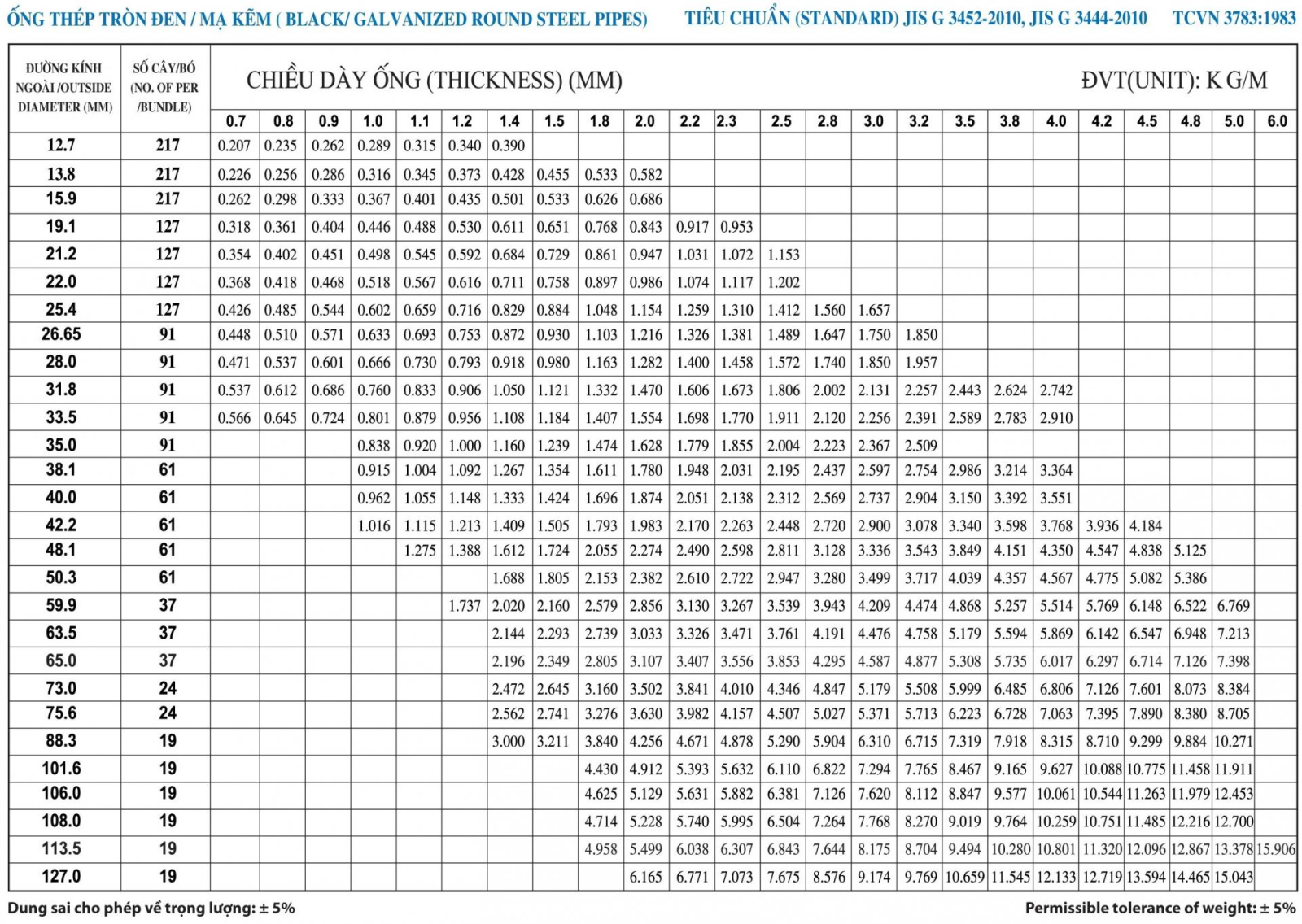 | Đường kính ngoài (mm) | Độ dày (mm) | Tiêu chuẩn | Barem (kg/m) |