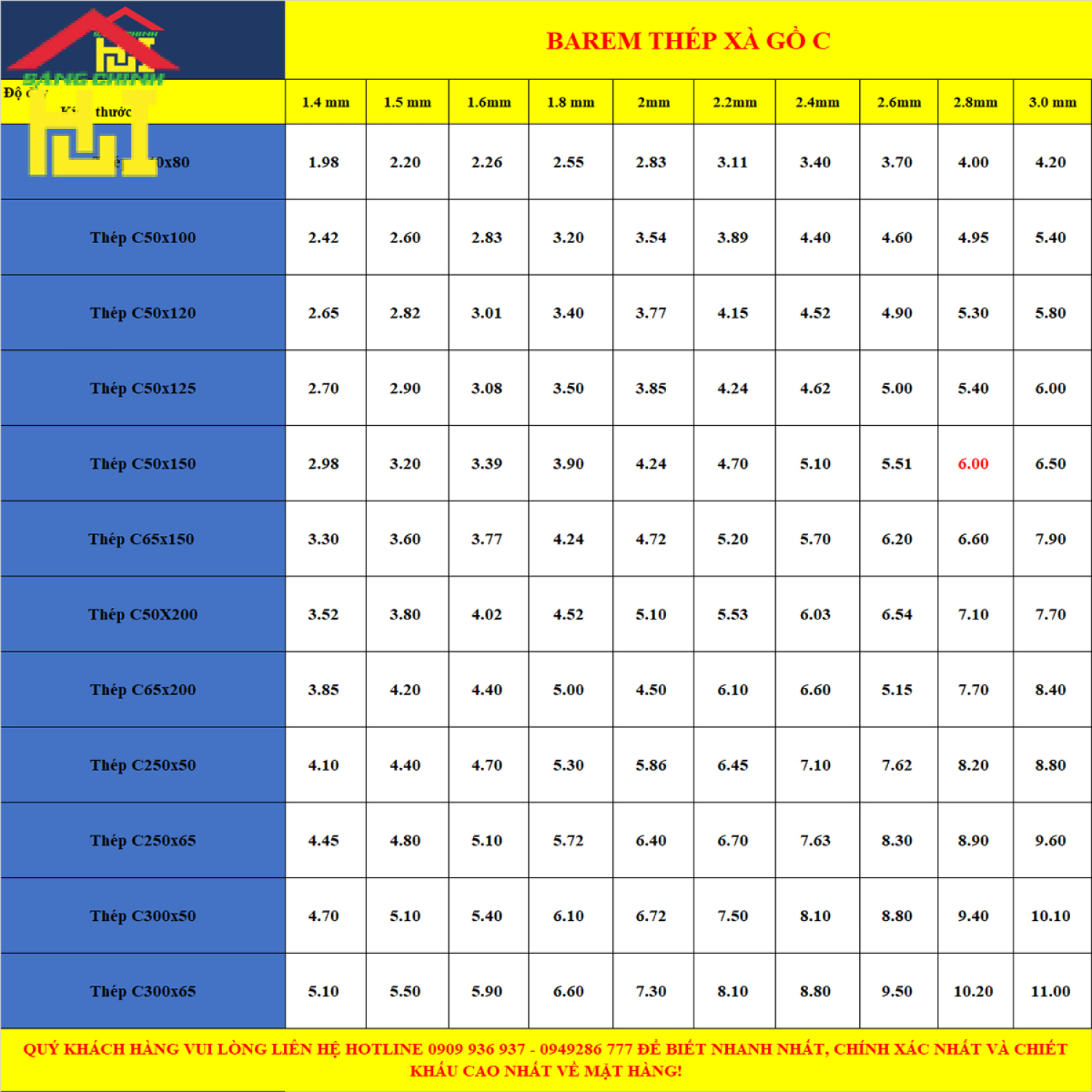 Thép C50x150   2.98 3.20 3.39 3.90 4.24 4.70 5.10 5.51 6.00 6.50