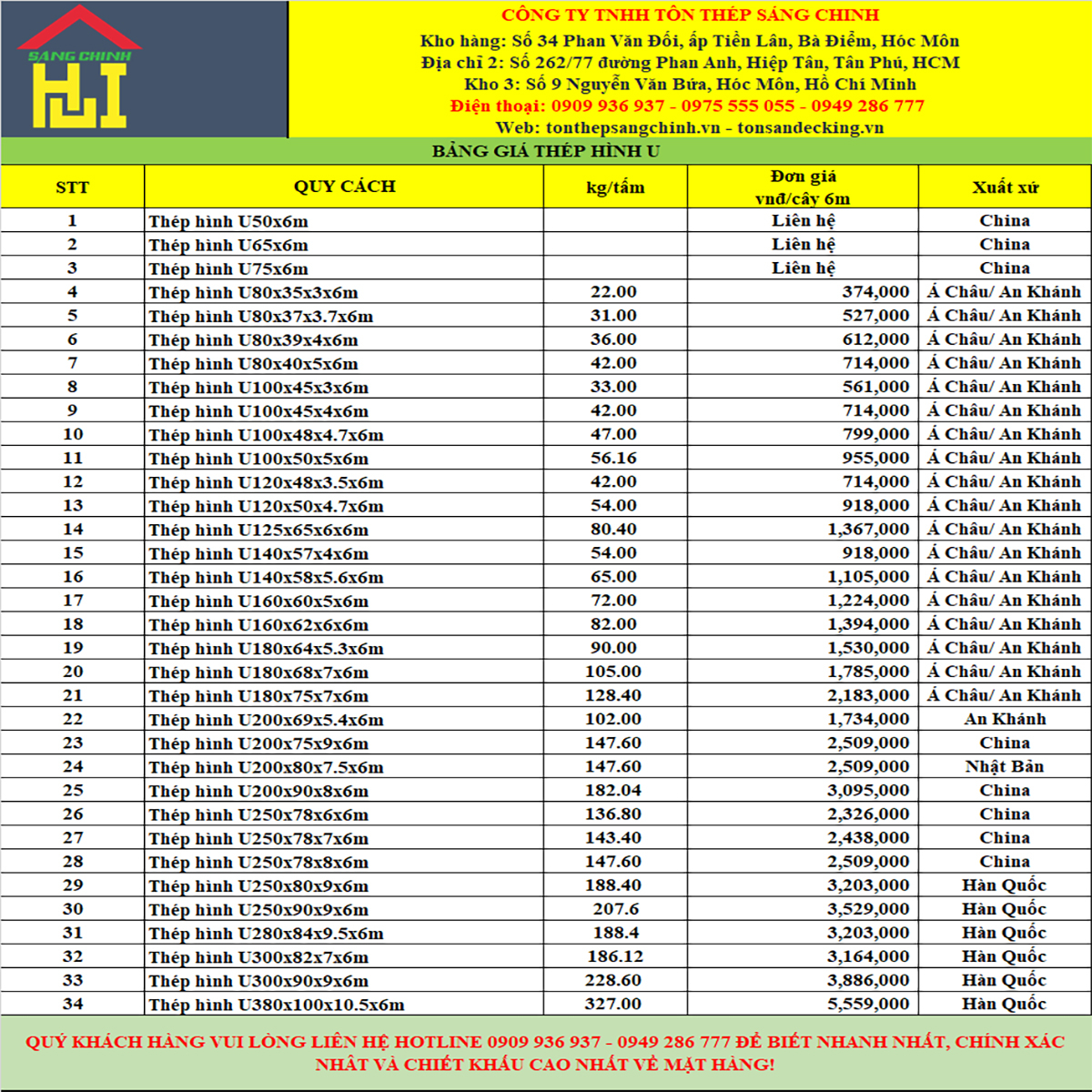 Bảng báo giá thép hình u tổng hợp mới nhất tại Sáng Chinh Steel
