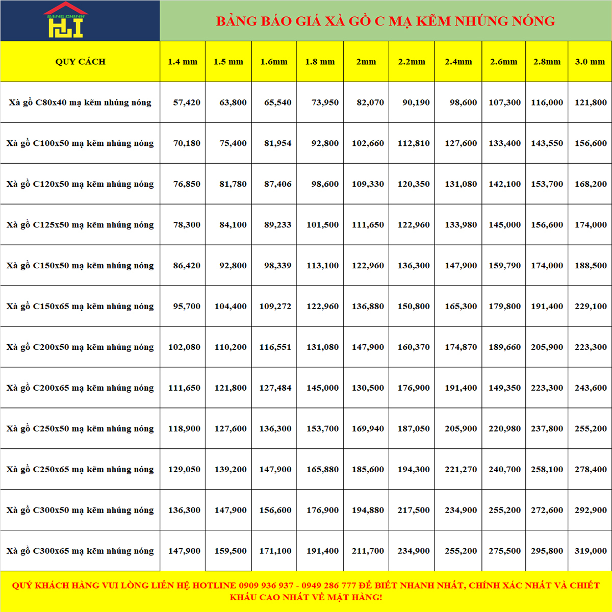 BẢNG BÁO GIÁ XÀ GỒ C MẠ KẼM NHÚNG NÓNG TẠI SÁNG CHINH STEEL