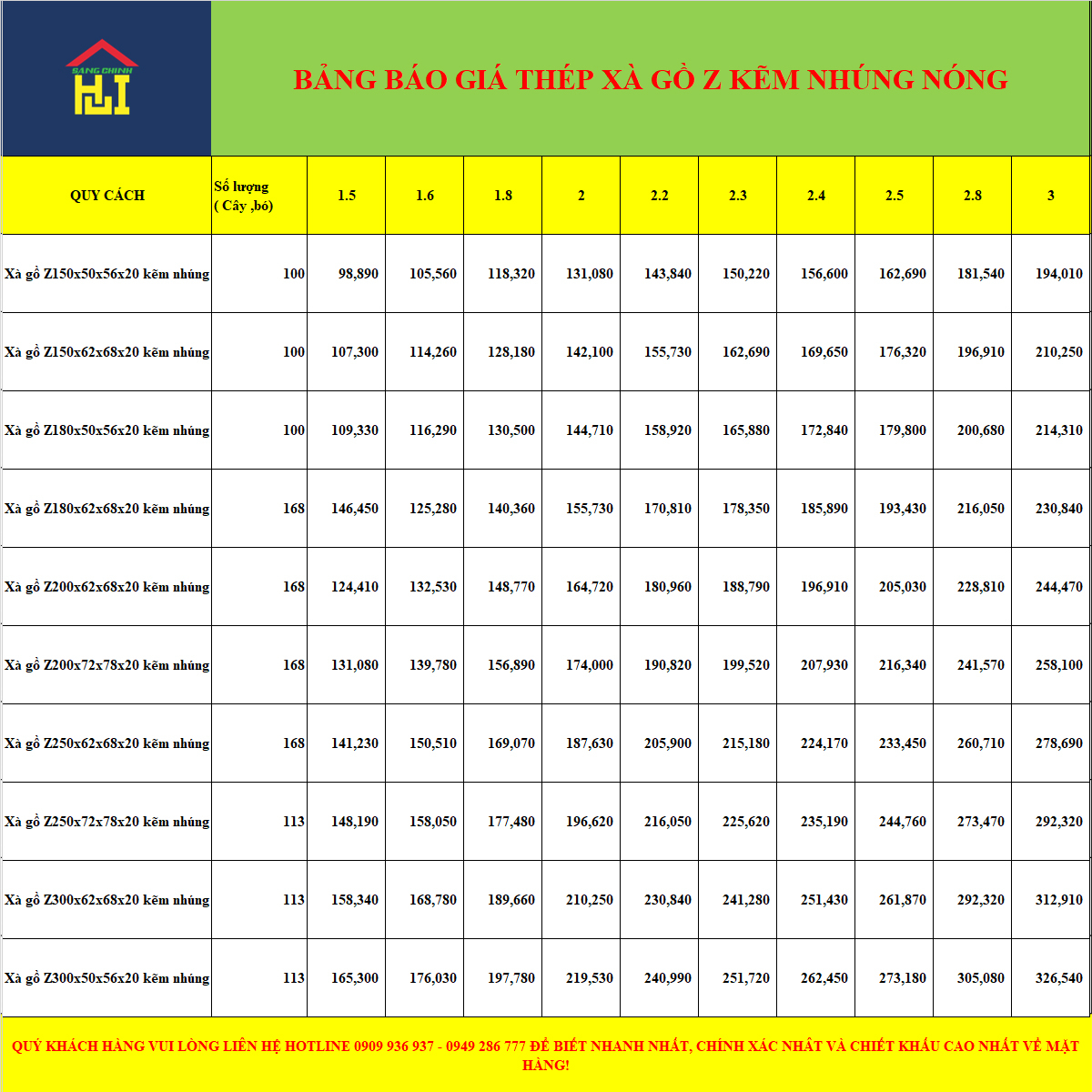 Sáng Chinh Steel BẢNG BÁO GIÁ THÉP XÀ GỒ Z KẼM NHÚNG NÓNG