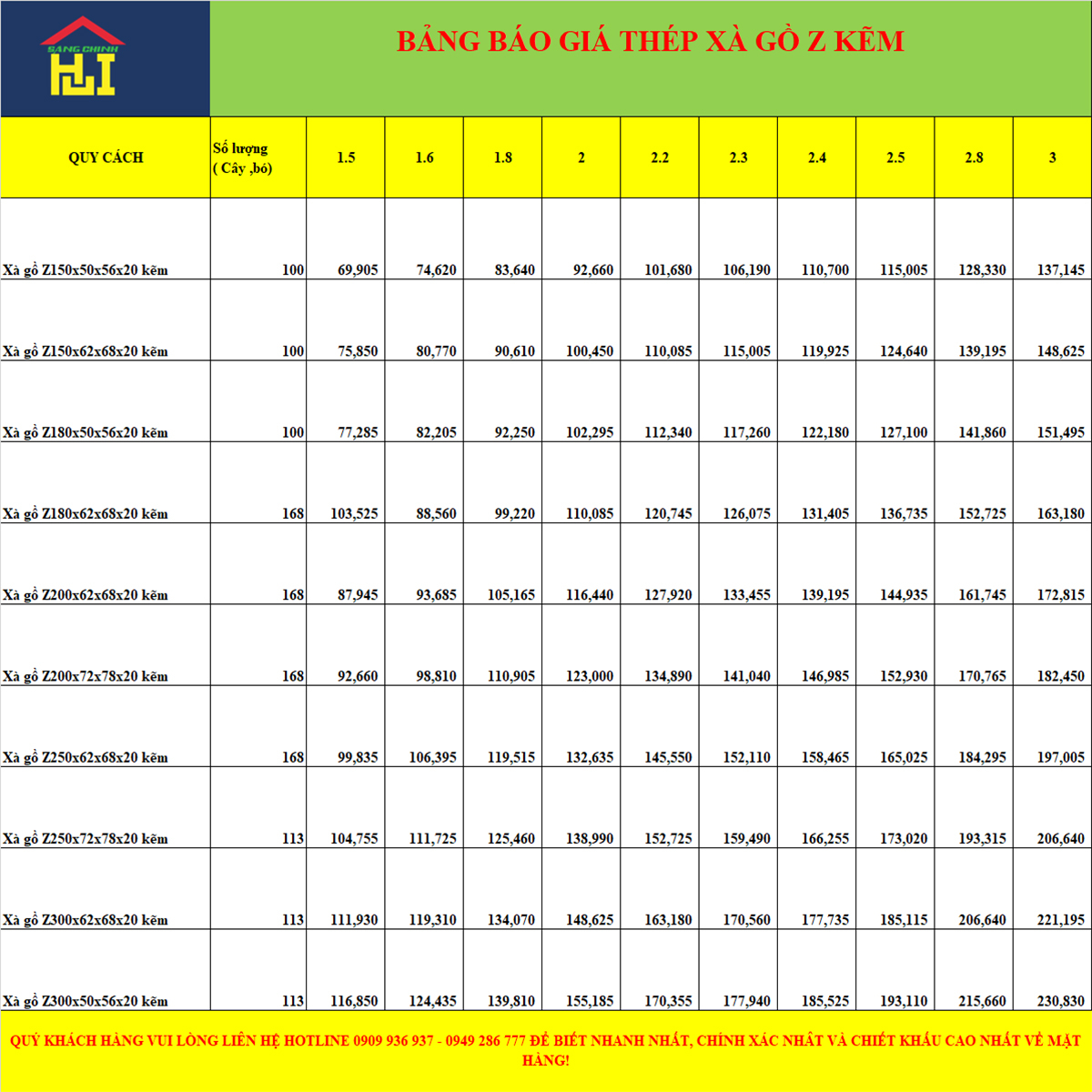Sáng Chinh Steel BẢNG BÁO GIÁ THÉP XÀ GỒ Z KẼM